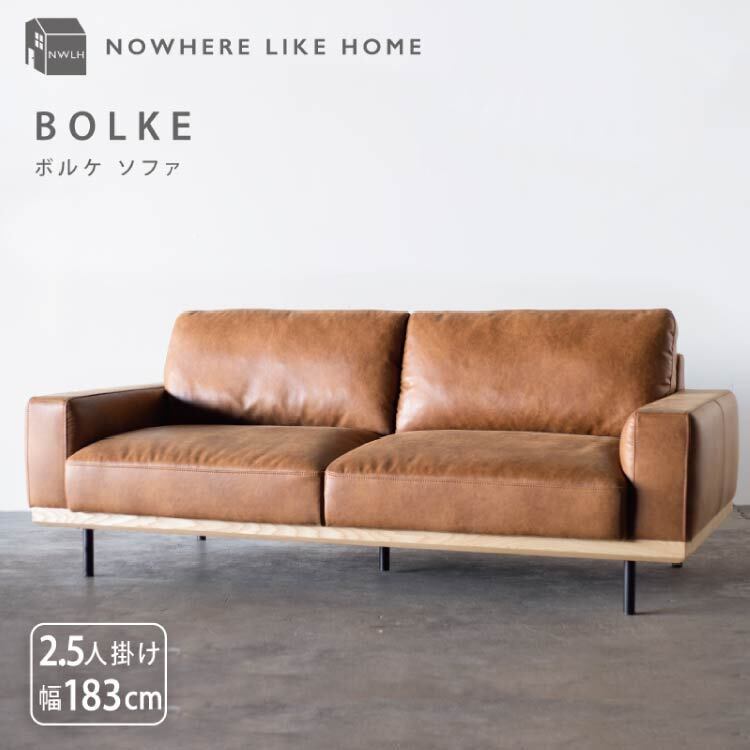 【張込み仕様】NOWHERE LIKE HOME ソファ BOLKE(ボルケ)2.5人掛け(2.5P) - スーパーレザーテックス オーカーブラウン フェザークッション アッシュ材 スチール脚 高密度ウレタン