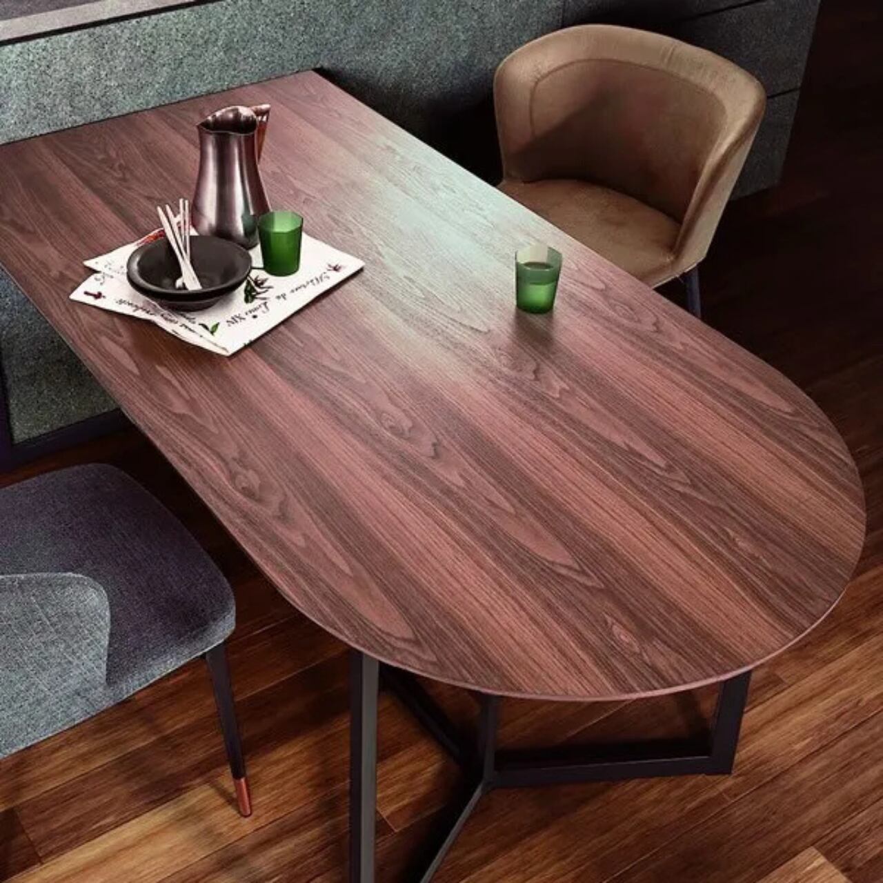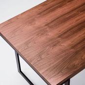 天板は落ち着いた色合いのウォールナット突板、脚部はクールなサンドブラックのスチールフレーム。