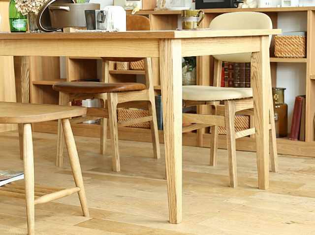 天板にはオークの美しい木目が楽しめるオーク突板、脚部には丈夫なアッシュ無垢材を使用。