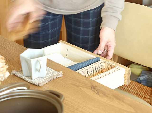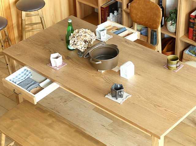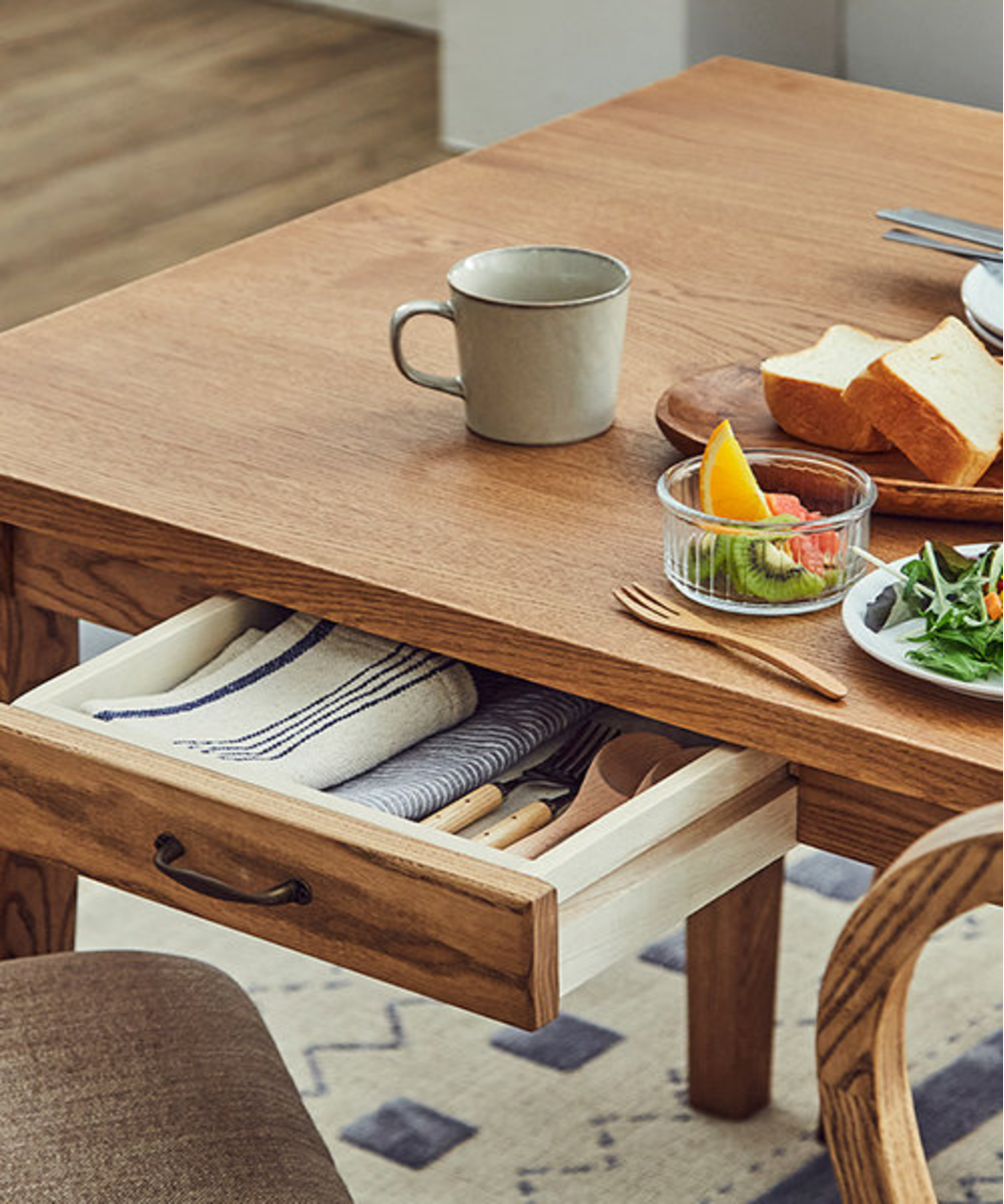 テーブルの天板下には、食事の際に散らかりがちなカトラリーや、読みかけの雑誌、文房具などをすっきりと片付けられる便利な引出しが2杯付いています。