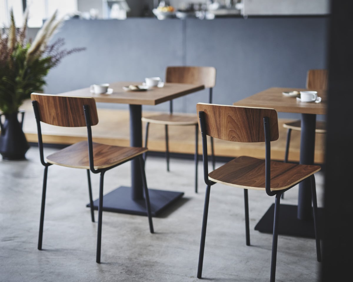 検索キーワード: QUON, クオン, オルディ, Ordiy, スチール椅子, 板座, チーク突板, 業務用椅子, 店舗家具, カフェチェア, ミニマリズム, I.JOH