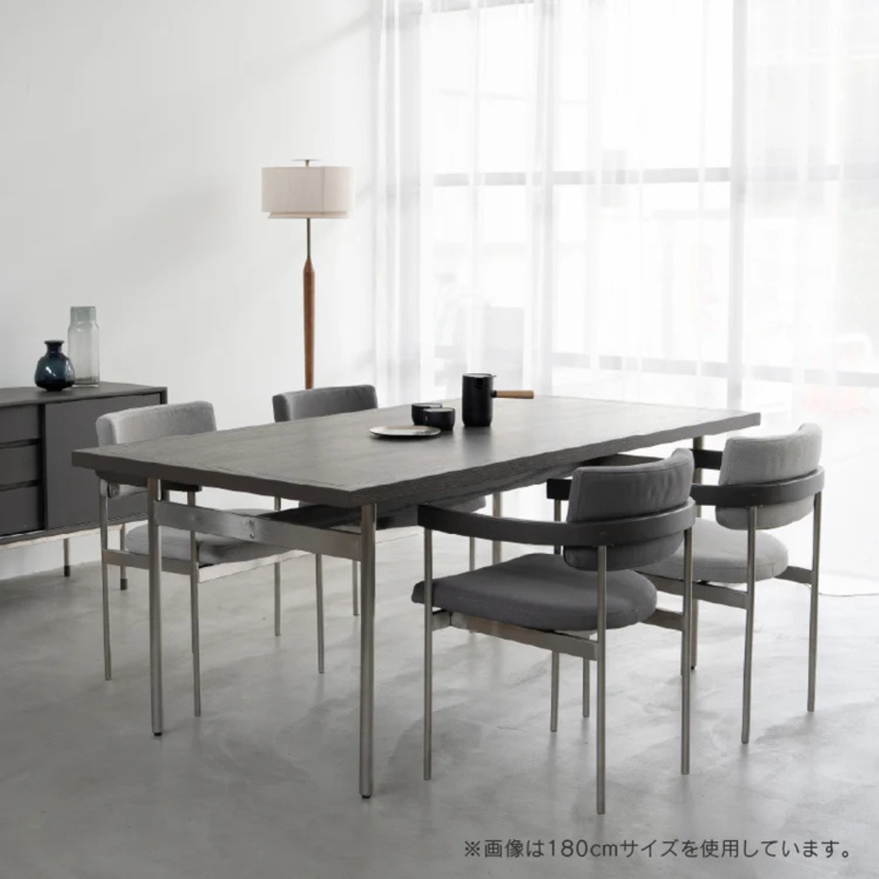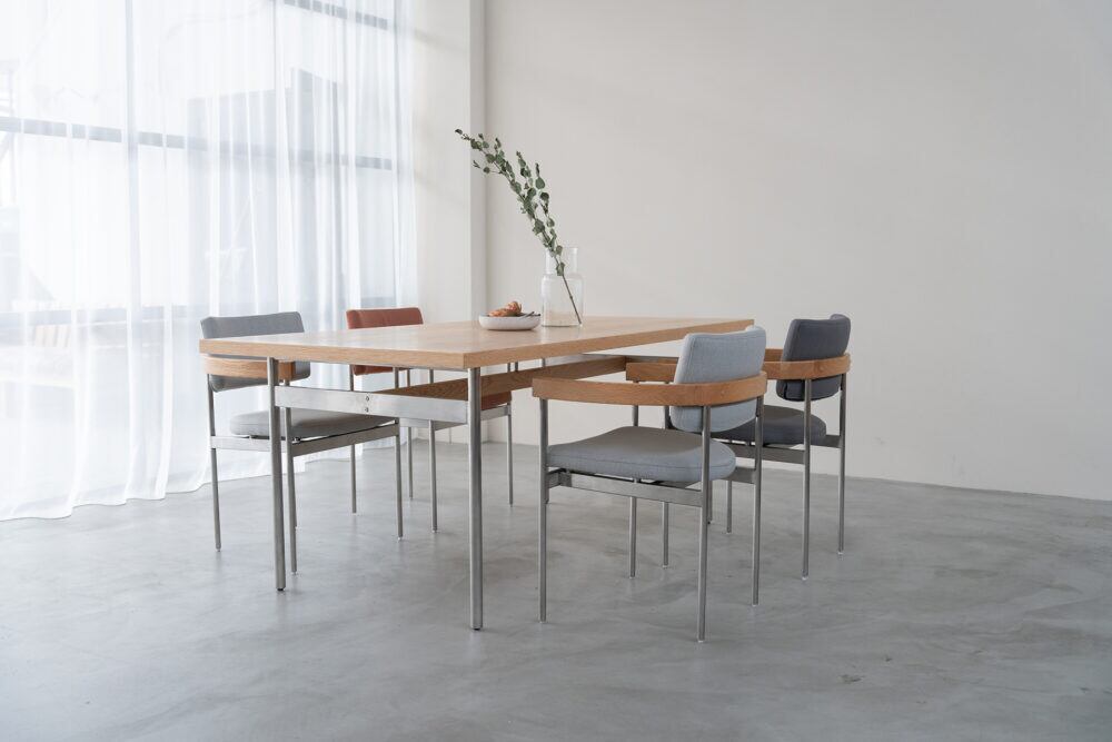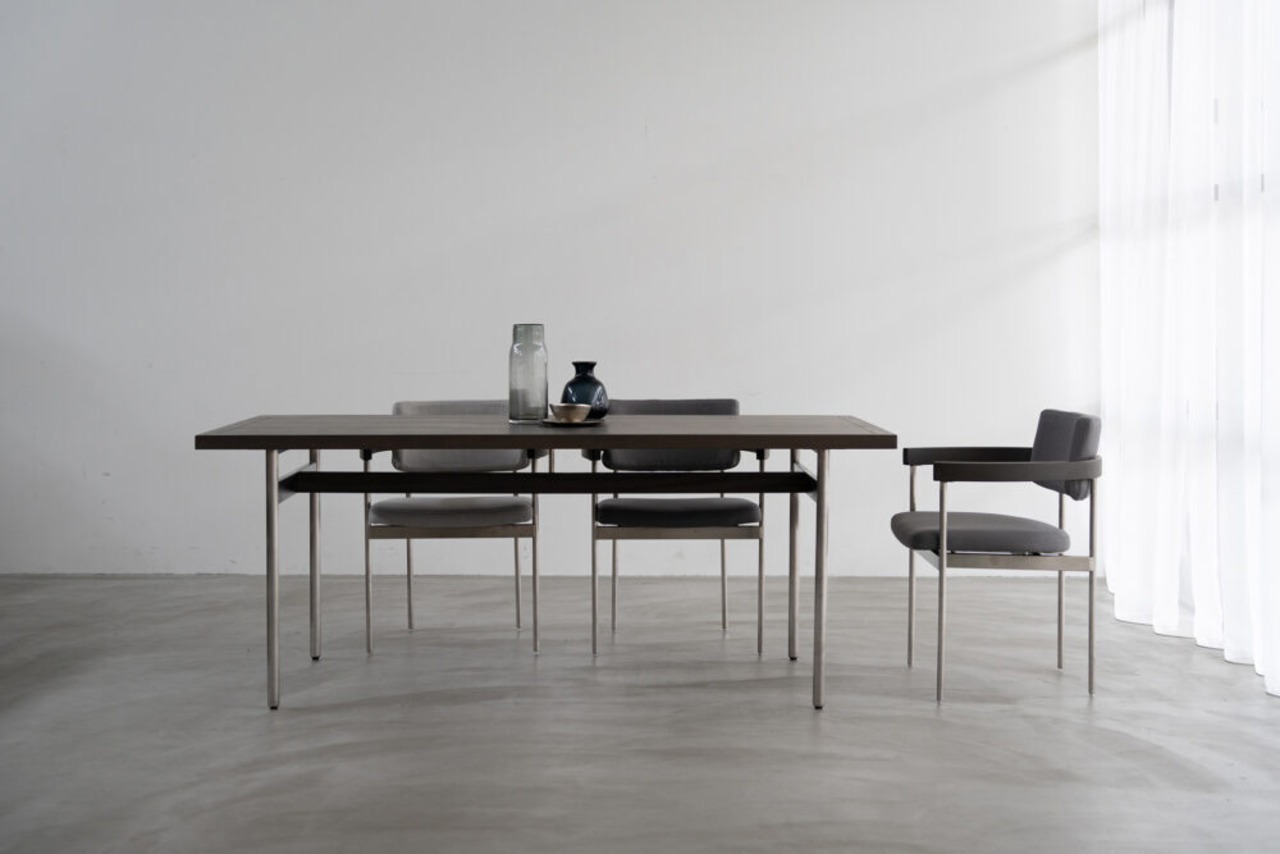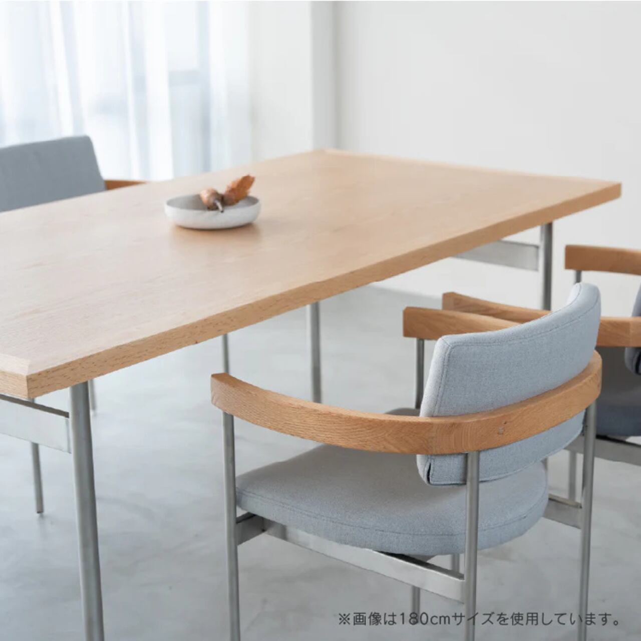 ヘアライン加工されたステンレス脚と、シャープですっきりとしたオーク材の木部との組み合わせが心地よく、ダイニング空間にモダンで上質な雰囲気を創り出します。