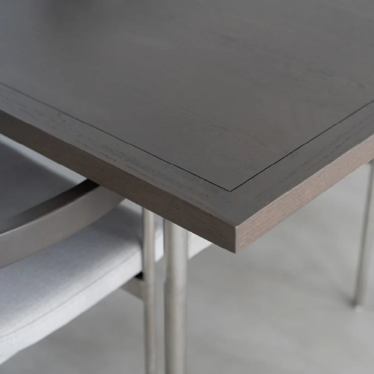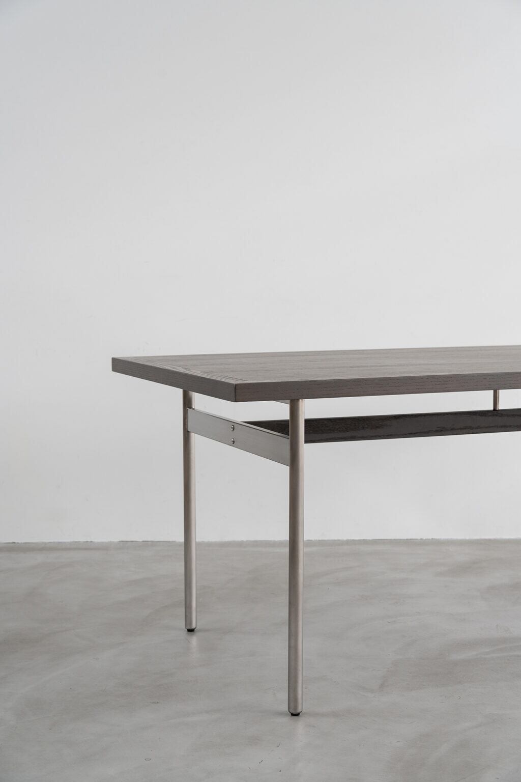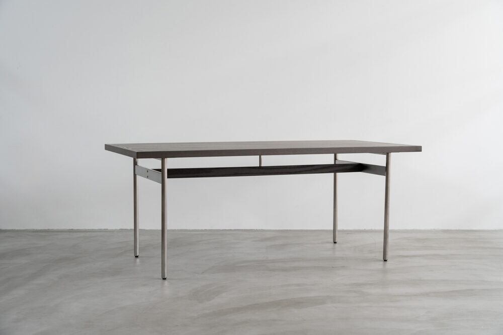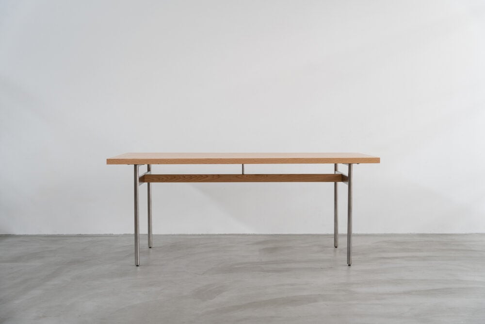ヘアライン加工されたステンレス脚と、シャープですっきりとしたオーク材の木部との組み合わせが心地よく、ダイニング空間にモダンで上質な雰囲気を創り出します。