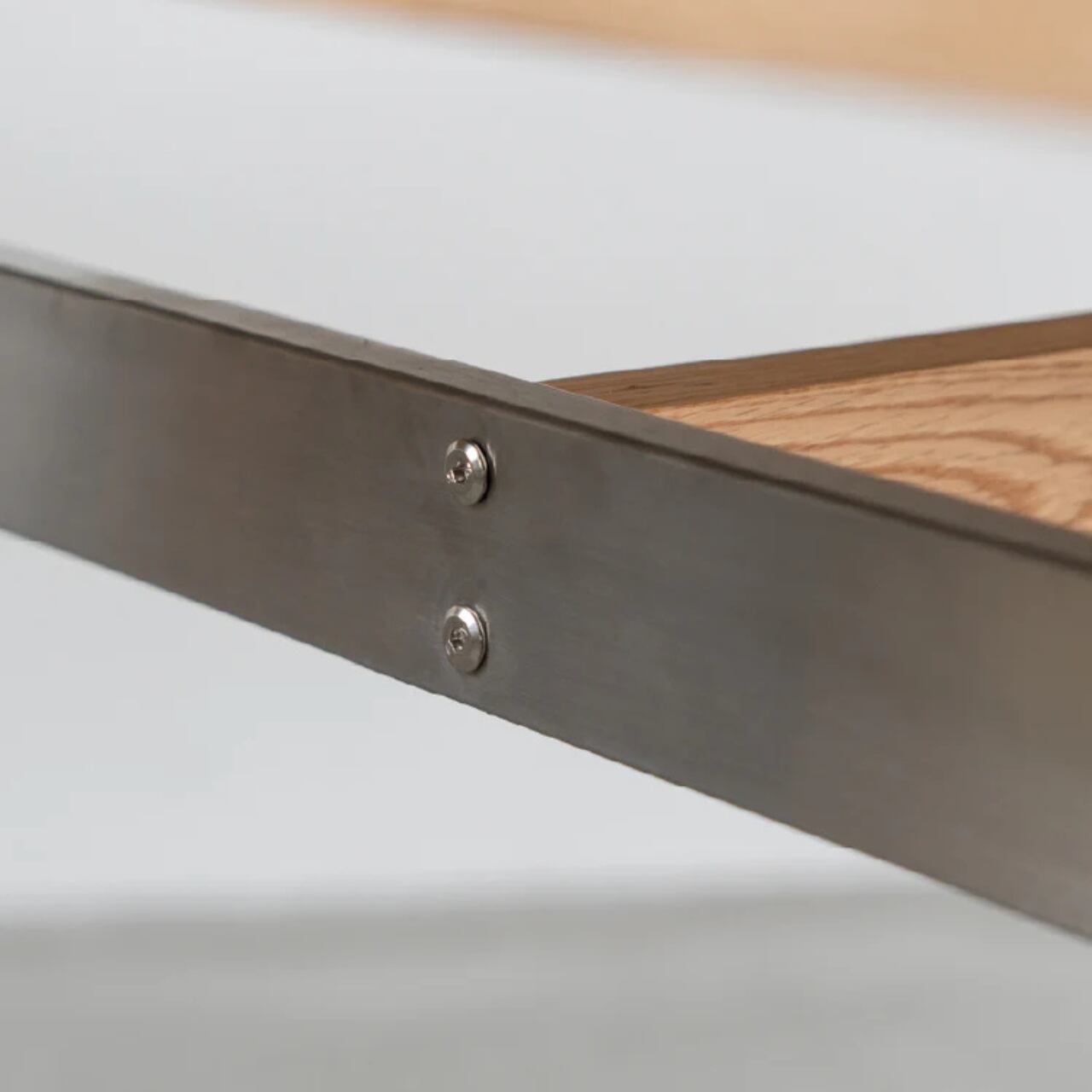 ■ 脚部(意匠性): 脚部にはヘアライン加工が施されたステンレスを採用。光沢を抑えた繊細な質感が、オーク材の温もりを引き立てるクールで洗練されたデザインです。