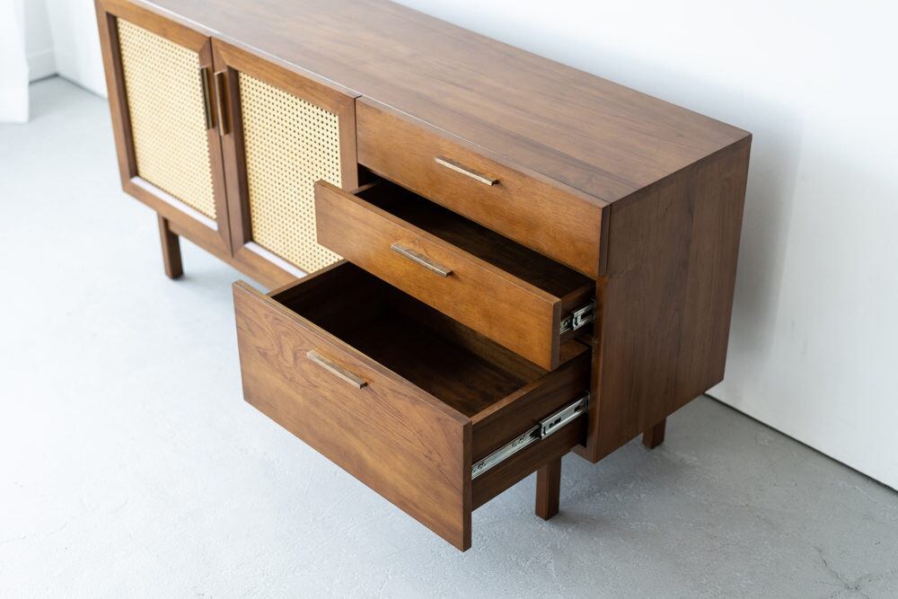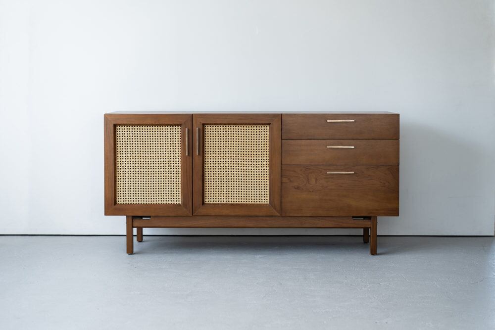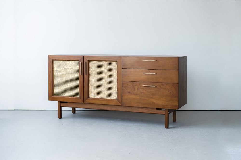 本製品は、ヴィンテージ家具の雰囲気を再現したデザインが特徴で、チーク材とラタンの組合せ、真鍮のハンドルといったこだわりのディティールが随所に散りばめられています。