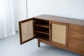 風格のある佇まいに、ラタンの扉が程よい抜け感を生み出しており、リビングやダイニングで空間の主役となる収納家具です。