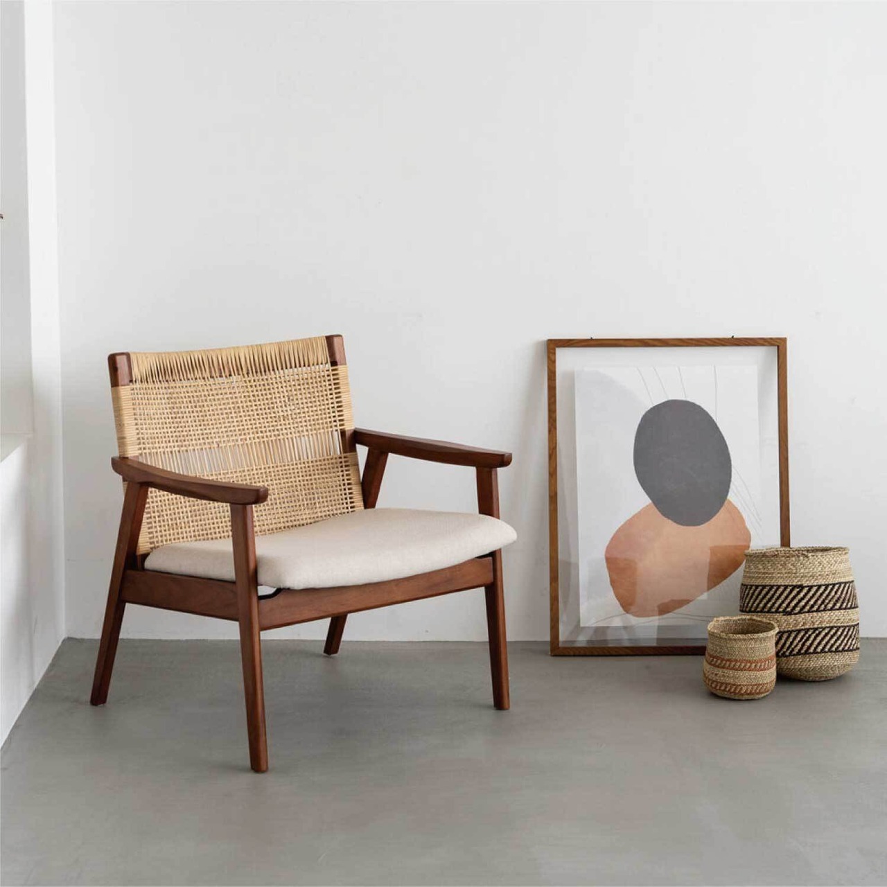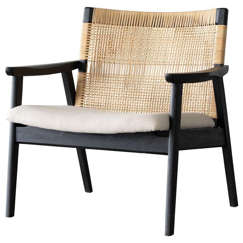 ラタン・チーク・ファブリックの組み合わせが、モダンなコントラストを生み出します。