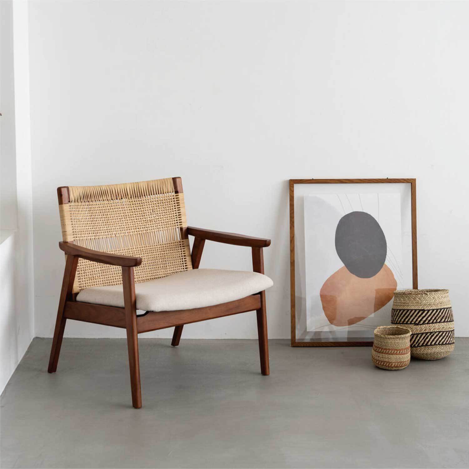 一点一点丁寧に作られたハンドクラフトの温かみが感じられ、チーク・ラタン・ファブリックの素材のコントラストが、リビングのアクセントとして空間を格上げします。