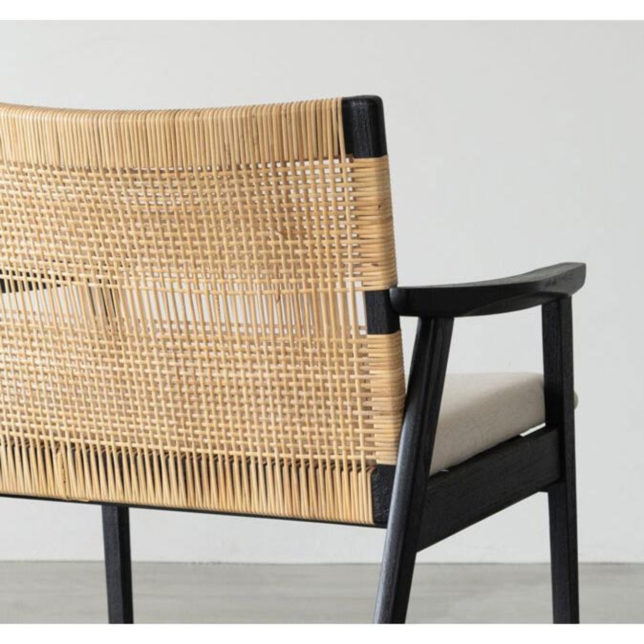 本製品は、背面にラタンを丁寧に手作業で編み込んだ美しいデザインが特徴です。