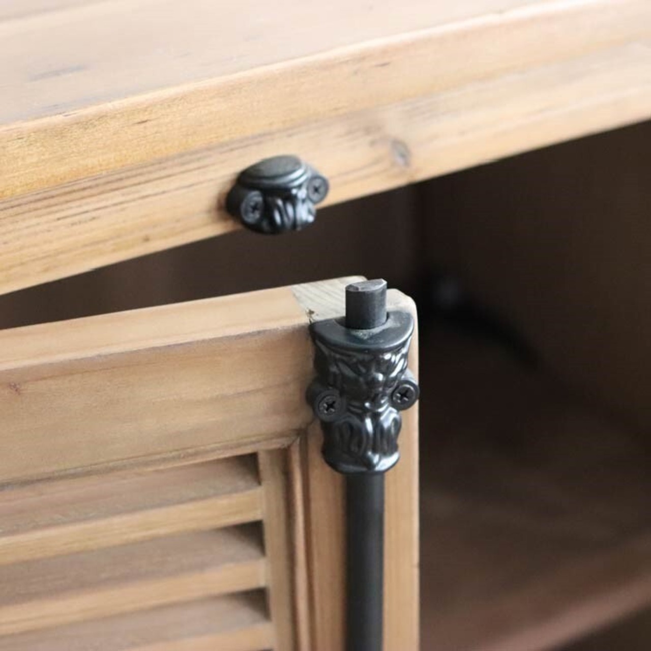 アンティークのドアノブを思わせるグレモン錠(鋳鉄パーツ)を採用。楕円のハンドルをひねることで上下のロックが解除され、扉が開く仕組みで、古材の素朴さに華やかさを添えています。