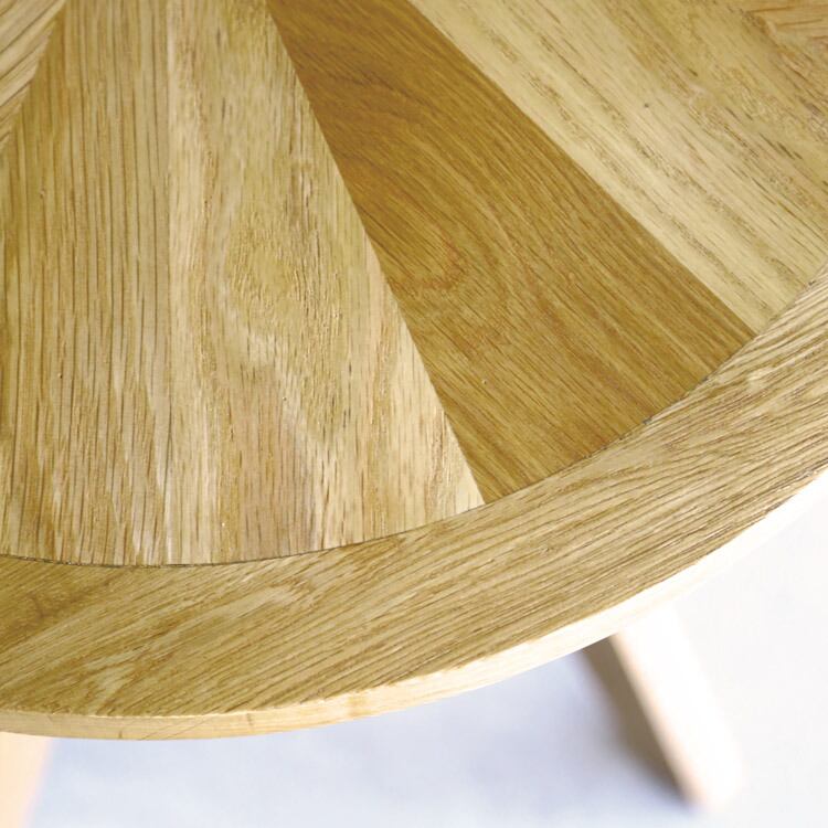 天板にはオーク材を使用。異なる色の木材を組み合わせる「寄木(よせぎ)」の技法により、中心から外側へ放射状に広がる印象的な幾何学模様が描かれています。