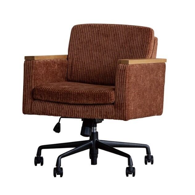 落ち着いたヴィンテージカラーのファブリックと木肘がアクセントになった、バレルシリーズのデスクチェアです。