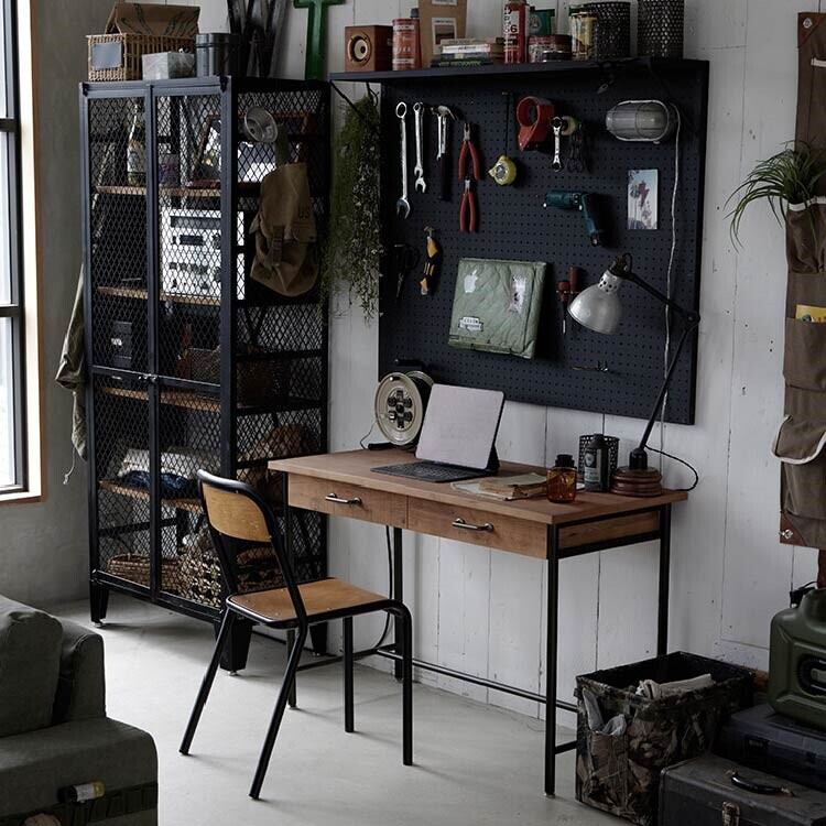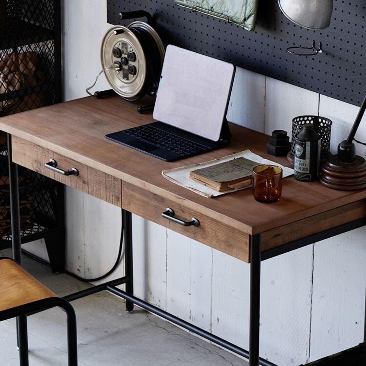 異なる質感の素材を組み合わせたシンプルなデスクです。使用している古材は、独特の風合いを残すため、色ムラや釘跡、傷等を味わいとして残しています。同じものは一つとしてない、古材の個性をお楽しみください。