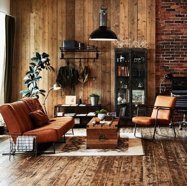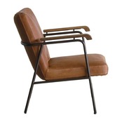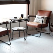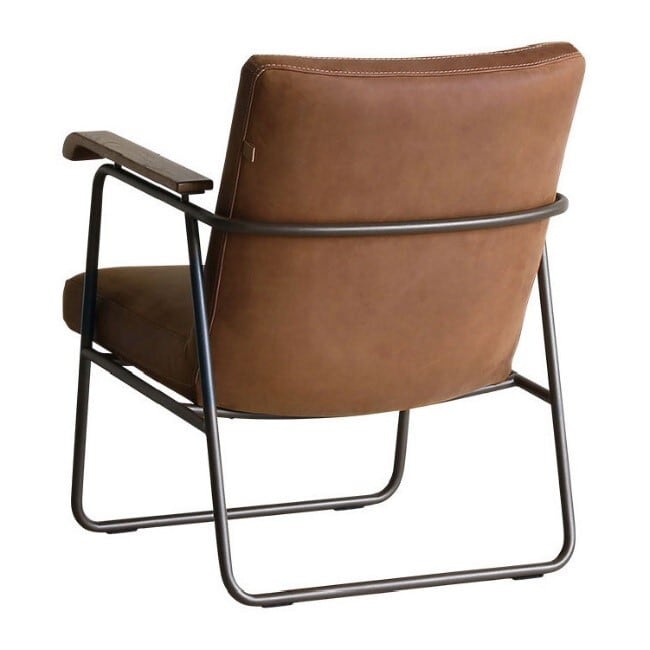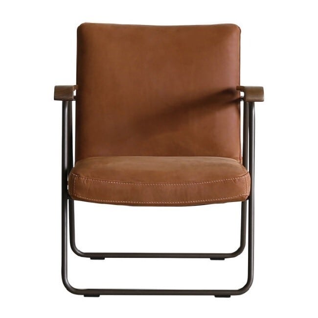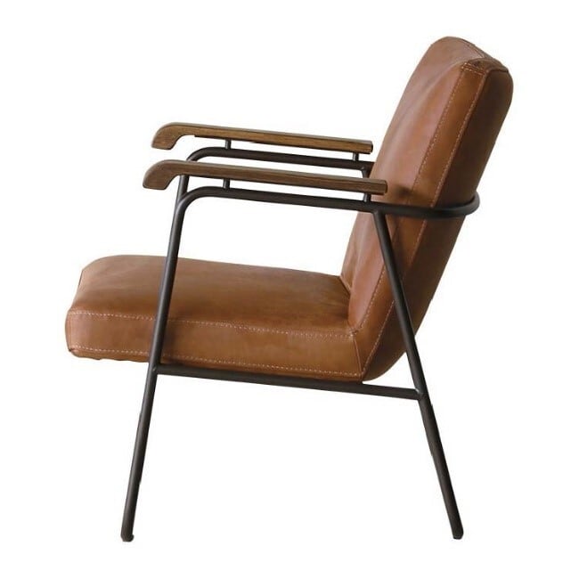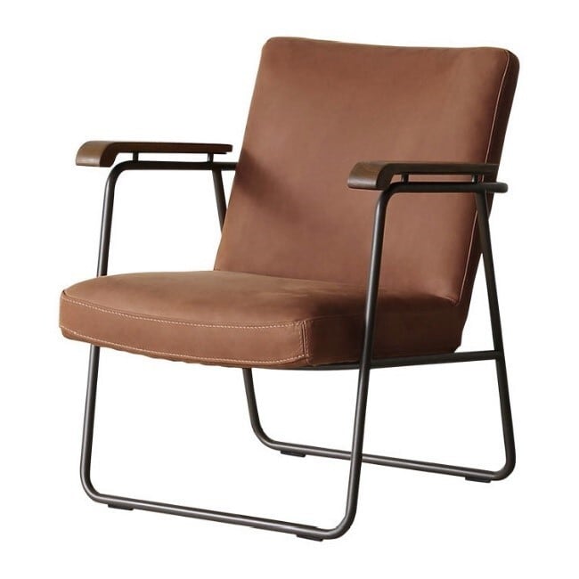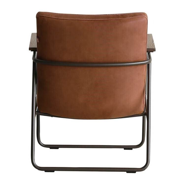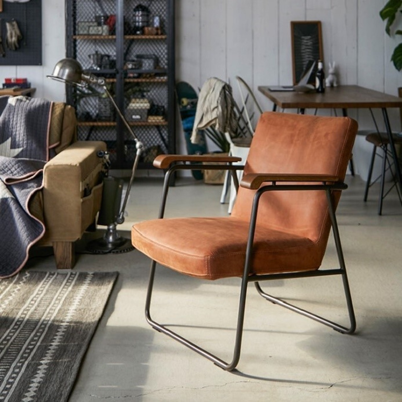 軍物やアウトドアなどで使用されているフォールディングチェアがモチーフの一人掛けソファ。スチールフレームに木製アームを合わせたヴィンテージスタイル。